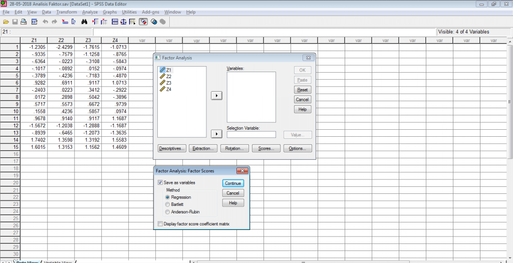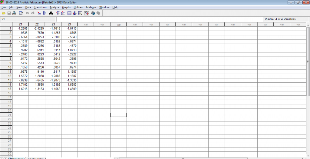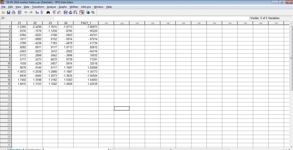 Selain bentuk output SPSS di atas, pada jendela Data View terdapat variabel baru yaitu skor dari faktor yang terbentuk. Nilai skor inilah yang nantinya menjadi data variabel baru yang dapat langsung diinterpretasikan maupun dilakukan pengujian lanjutan terhadap data variabel terbentuk.