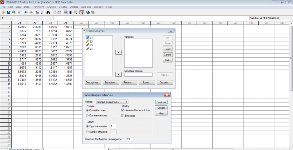 Klik pada menu Extraction, pilih Method pada Principal Components dan pada Display centang tambahan untuk menampilkan Scree Plot lalu klik Continue, seperti tampak pada gambar berikut.