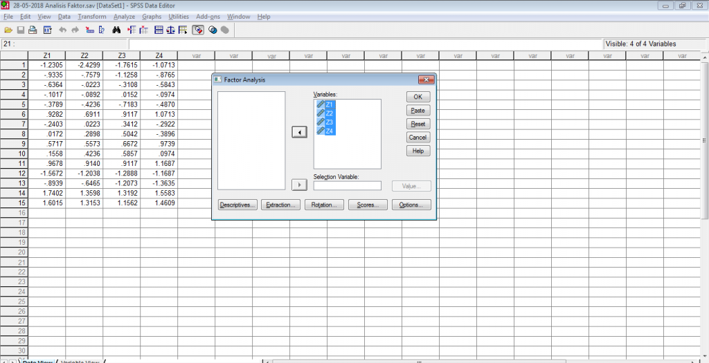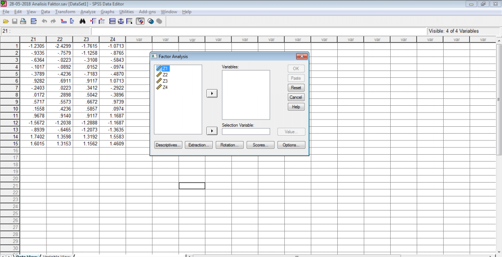 Setelahnya klik pada menu Analyse, pilih menu Data Reduction dan Factor lalu klik, maka akan muncul jendela seperti gambar berikut.