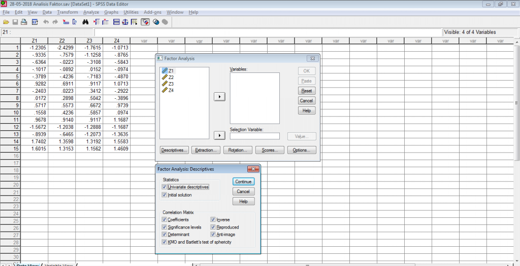 Klik pada menu Descriptive, pilih centang semua item yang ada pada menu Statistics dan Correlation Matrix untuk mendapatkan semua informasi yang diperlukan terkait pengujian analisis faktor pada data penelitian lalu klik Continue, seperti tampak pada gambar berikut.