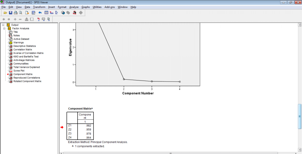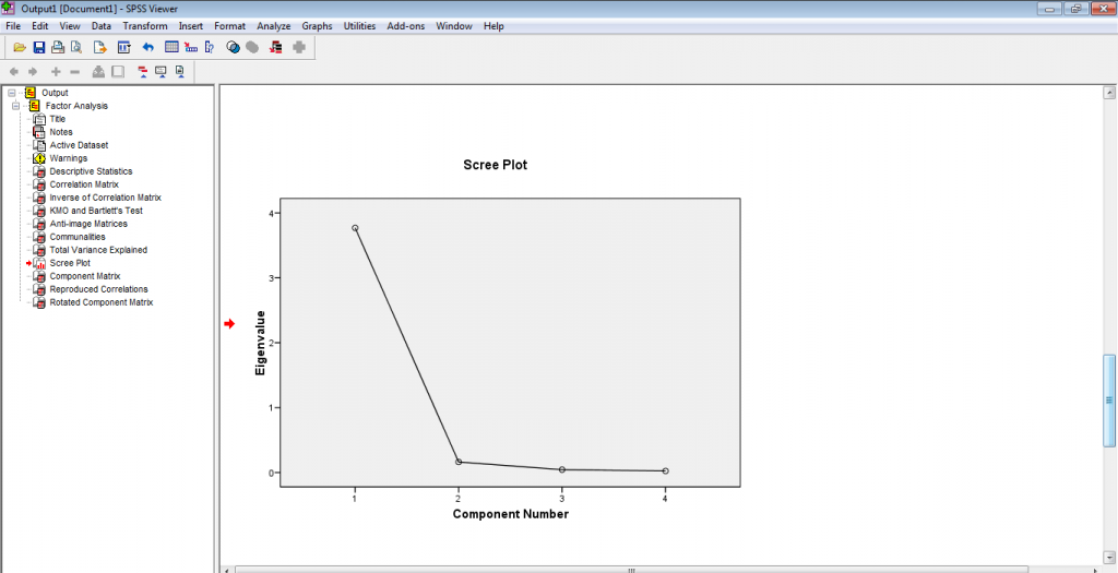 Hasil dari analisis faktor dengan menggunakan metode Principal Component yang diproses oleh SPSS seperti ditunjukkan pada gambar berikut. Penjelasan pada output SPSS disesuaikan dengan penjelasan pada artikel sebelumnya. Yang penting untuk diperhatikan adalah penentuan jumlah komponen utama dan besar keragaman yang dapat dijelaskan oleh komponen utama.