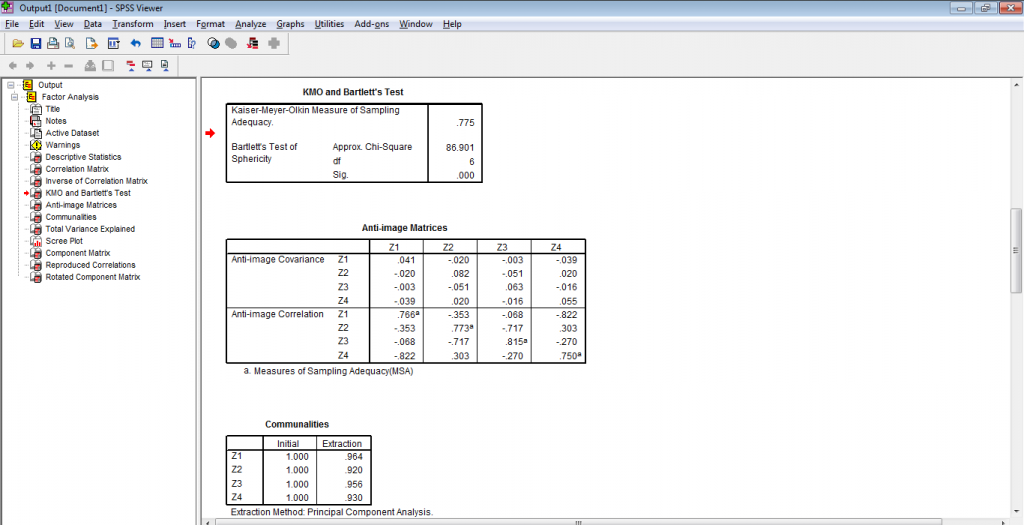 Tentunya nilai KMO yang tinggi yang diharapkan. Hal ini mensarankan bahwa ukuran overall KMO harus lebih besar dari 0.800, akan tetapi jika didapati nilai ukuran overall KMO di atas 0.600 masih dapat ditoleransi. Untuk dapat menigkatkan ukuran overall KMO yang tinggi biasanya dapat dilakukan dengan cara menghapus variabel atau indikator yang memiliki ukuran individual KMO yang bernilai rendah.