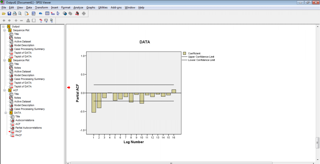 Pada korelogram yang dihasilkan pada pembahasan sebelumnya (baca artikel : Autokorelasi dan Autokorelasi Parsial Dengan SPSS). Seperti pada output SPSS berikut.